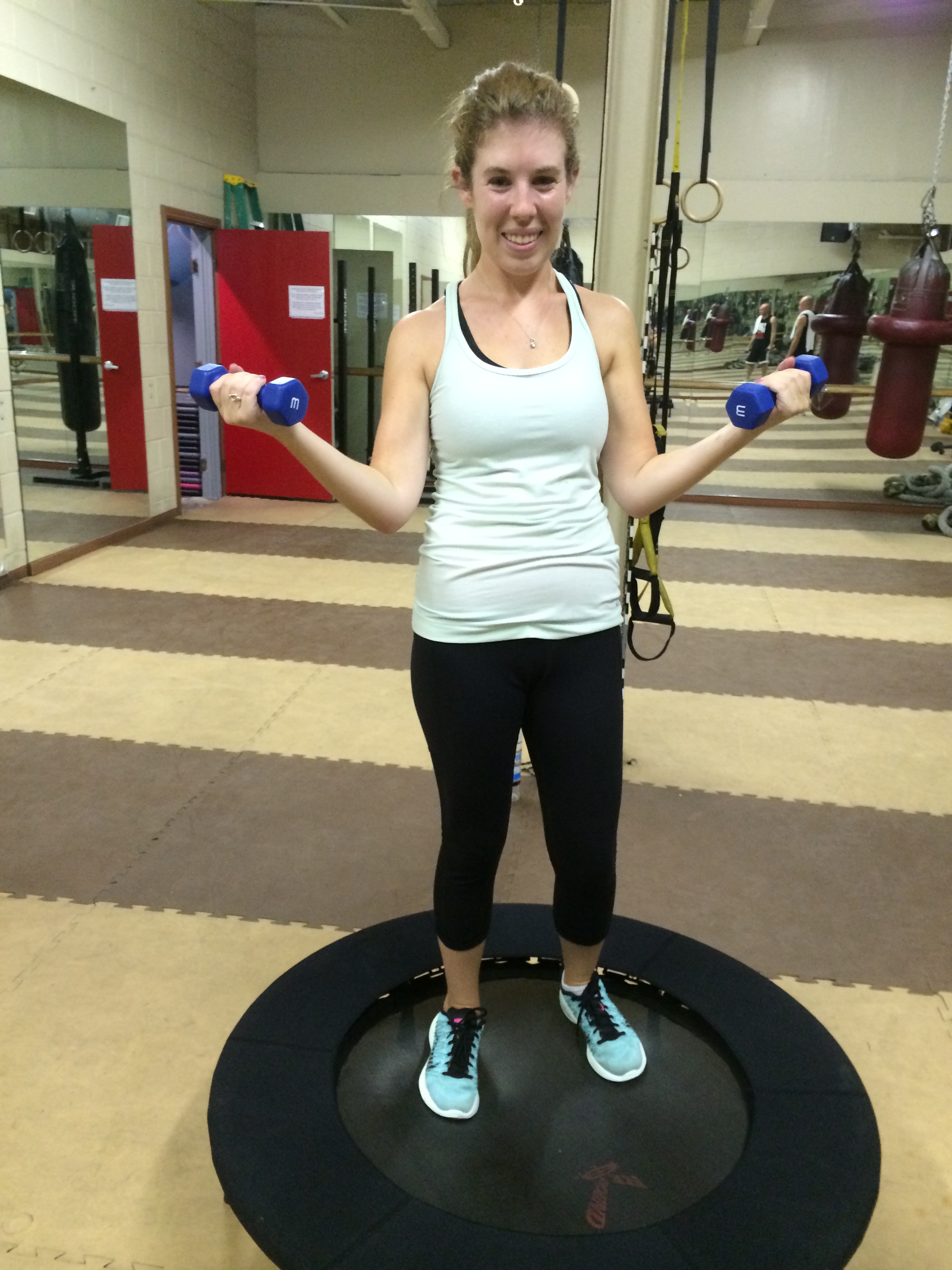 During class we alternated jumping on top the trampoline with lying down on it doing different exercises. While jumping, we sprinted in place, did high-knees, kicked to the sides, and even did an entire song punching the air with hand weights. Not only was my heart rate way up, but also I was really enjoying it.