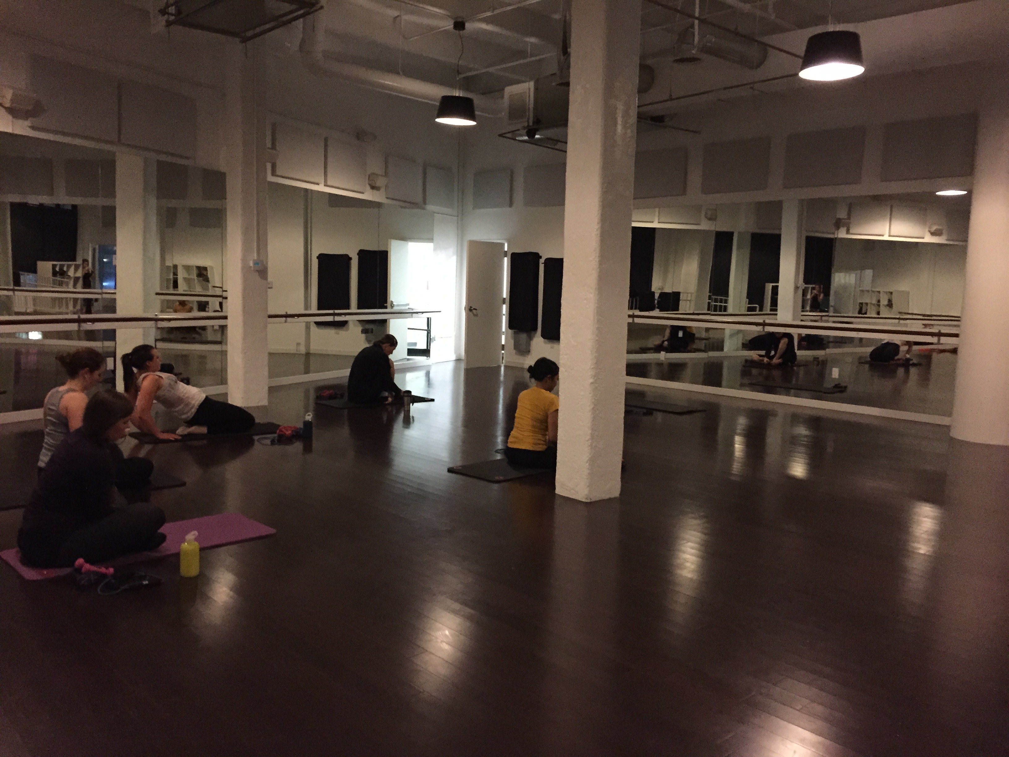 Next we used our light and heavy weights to do arm work. They felt even heavier than usual because of how exhausted my body was from the plank. We were at the barre for the remainder of class, working on thighs and butts, doing yoga poses in between to rest. The resistance band and tiny, low pulses wore out my legs really quickly. We ended with a long ab set, using the ball, and then the lights were turned off for a stretch.