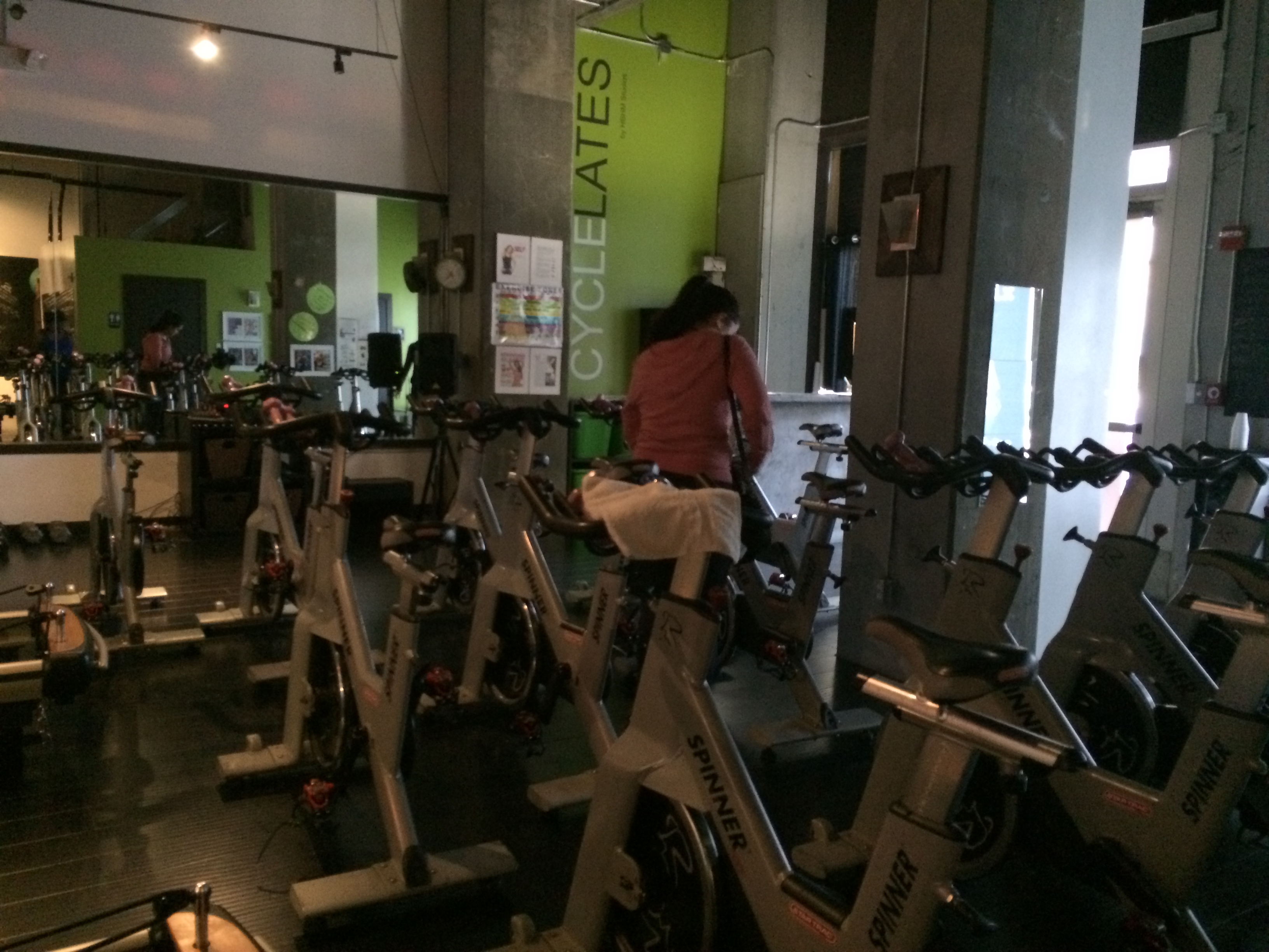 - Check your bike beforehand and make sure you completely tighten it. Bring spin shoes if you have them—the bikes are SPD clip compatible.
