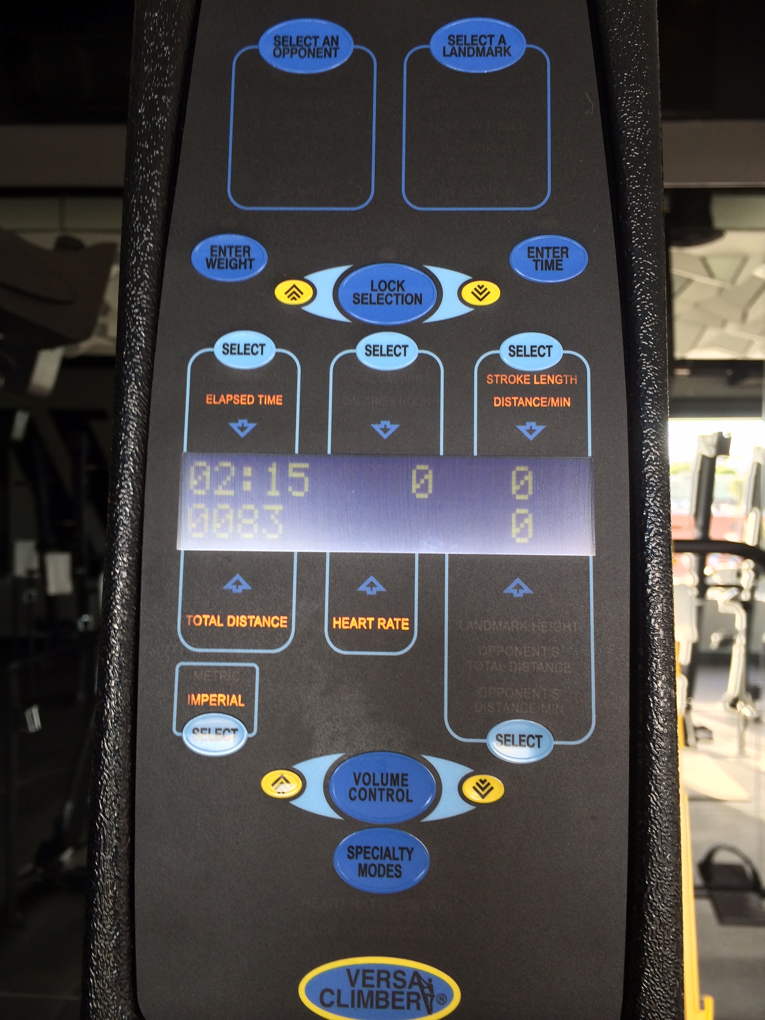 Alex pushed a button and suddenly screens came down over the windows and the blinds quietly closed. The room was dark, the music loud, and there were light effects on the ceiling. It was quite a production! We began with a warm up where I had a chance to get used to the VersaClimber. The machine mimics climbing up a tall wall or steep mountain. It displays your distance, time, and stride length and has a knob to change the resistance.