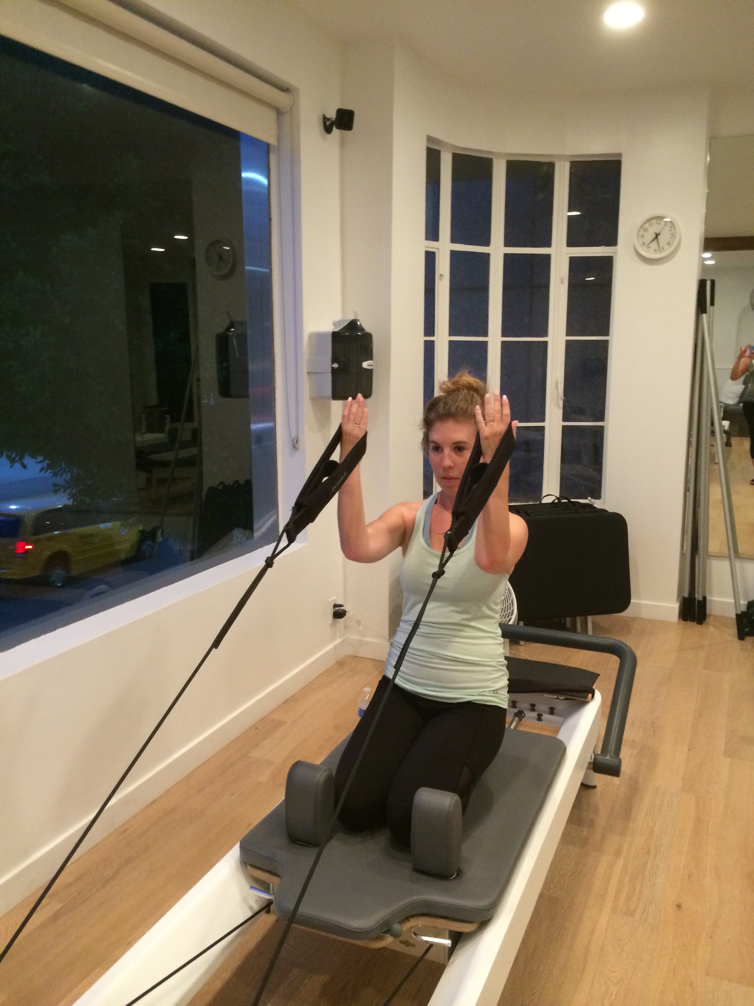 After we were “warmed up” we went into legs with some arm work peppered in for good measure. Instead of switching from leg to leg, we worked our left leg for 20 minutes (I checked the clock) and then our right for 20 minutes. Halfway through each leg I thought I was going to die from the heavy resistance of the springs. We did squats, lunges, presses, and bridges, sometimes using dumbbells at the same time.