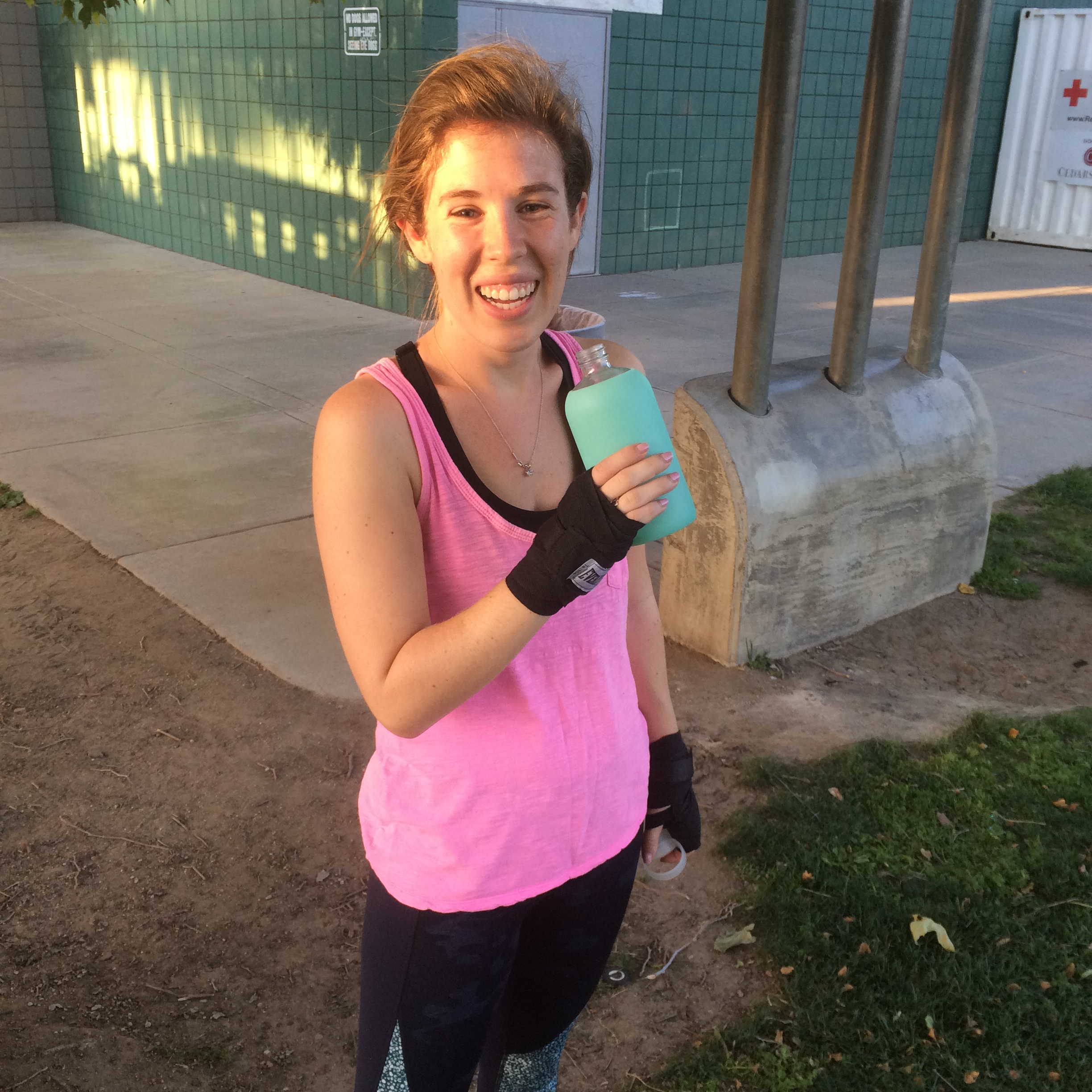 I was a little nervous about picking an outdoor location over a gym—would we have any props or just use bodyweight? I learned quickly that I had nothing to fear as James began unloading his bag: kettlebell, boxing gloves and wraps, and a resistance band with handles. We started with a stretch and then got into the workout. Throughout the hour, we focused on abs, legs, and arm work. I did crunches, planks, pushups, bicycles, lunges, squats, and kettlebell throws and rows—but most moves were modified a bit to make them even more difficult! For example, after each push up I had to raise one arm straight out and balance.