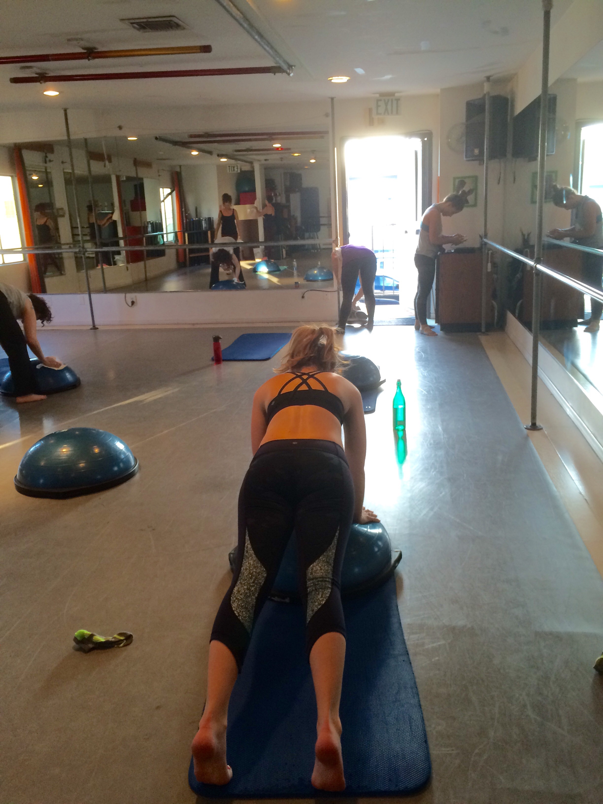 Although the class starts at 6pm according to the schedule, it really begins at 6:15. Those 15 minutes are a time for the regulars to catch up (it was a close knit group, but very friendly) and stretch. When class started, I quickly learned that the main goal was to mimic every movement that Thalia made, as she didn’t give any verbal directions. Throughout class we used the bosu ball to do push ups, lunges, unsteady kicks, a variety of crunches, and tricep dips. Some movements were quick while others required concentration to slowly maneuver the wobbly ball without toppling over. It’s definitely a learned skill as I was the worst at maintaining my balance. We stretched in between most exercises with a longer stretch period at the end.