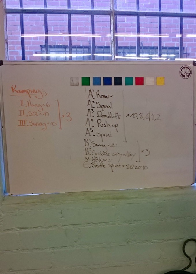 The coach, Orion, led the group in stretching, which is kept small to ensure safety and proper attention, and reminded us the importance of improving our flexibility. We then did a ramping (AKA the warm-up to us mere muggles) of callisthenic hangs, squats, and kettlebell swings. The workout was then divided into three sections: A, B, and C. We paired up to conquer each letter as a group, round robin style. This is the typical setup but every session has different exercises and it’s all written down so you don’t forget. This week’s workout included rows with rings, deadlifts, push-ups, and sprints in the alley next to the gym. We finished the training with another stretch.
