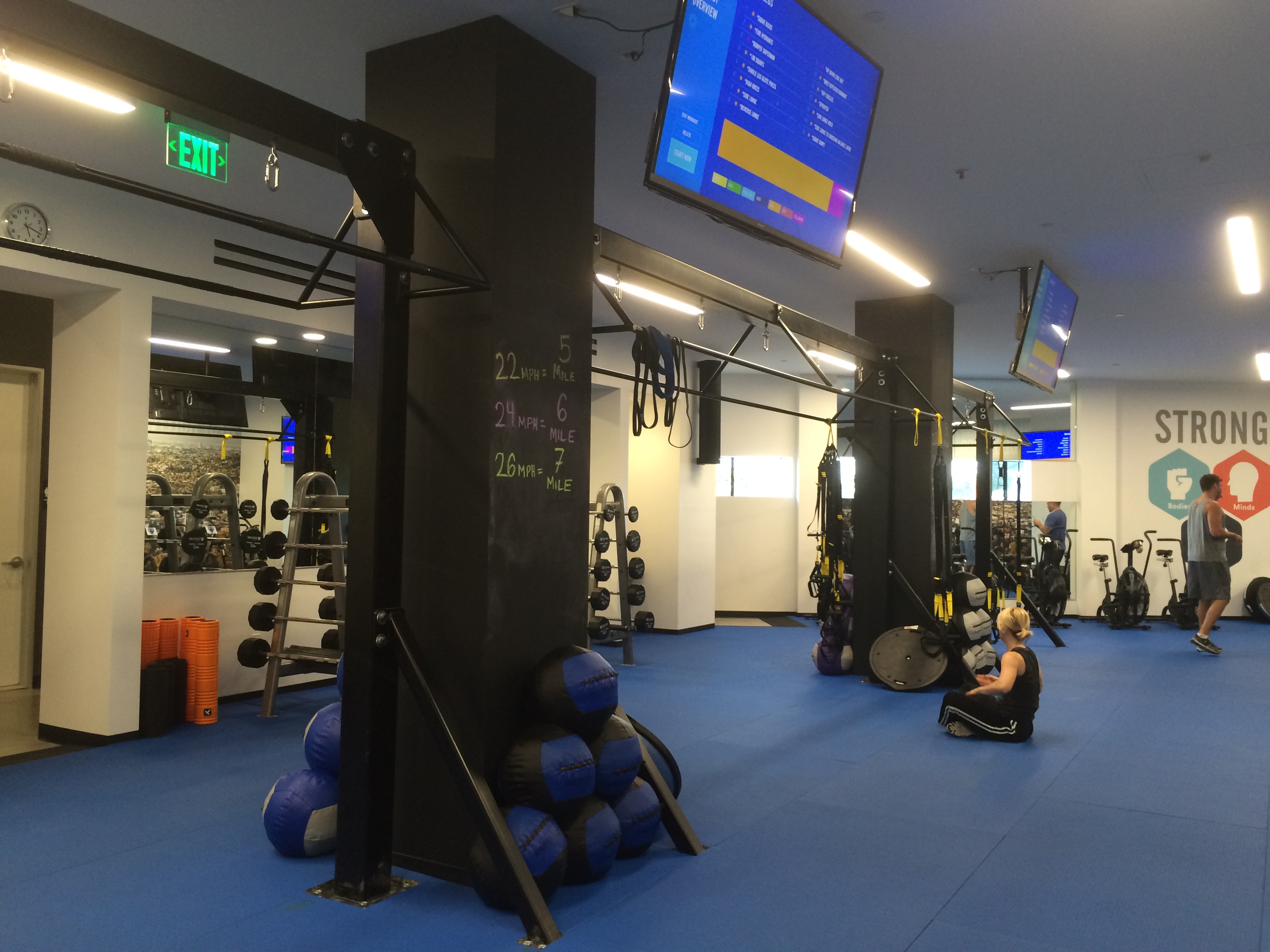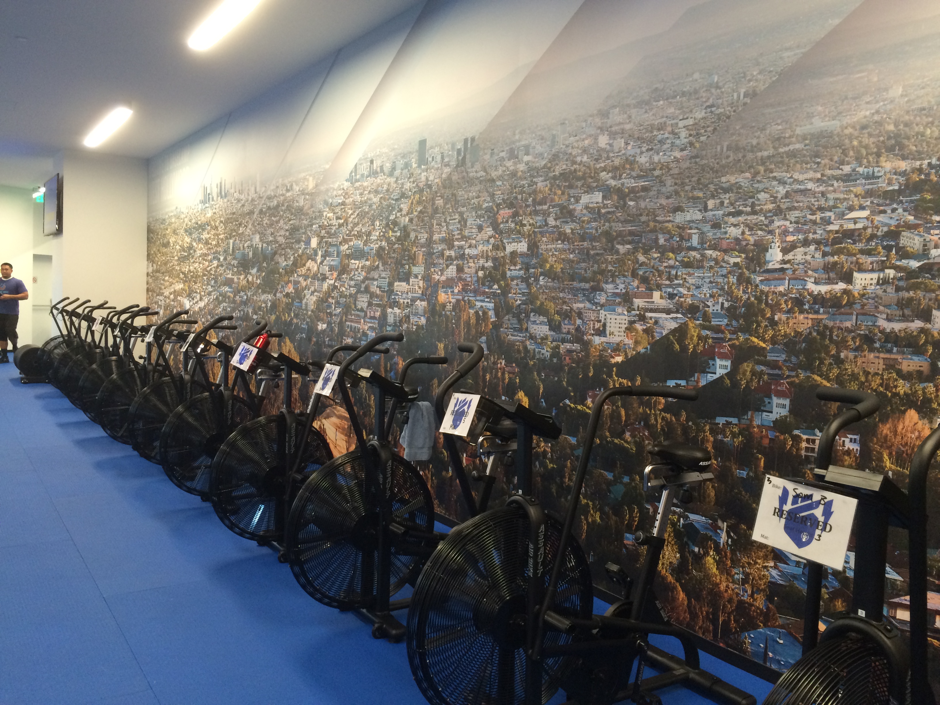There are four letter groups that are all doing something different at each time, but the TVs and instructor make it easy to follow. My group started on the bike. This bike isn’t a typical spin bike but rather an “air assault” bike that doesn’t have a resistance knob but instead utilizes wind resistance, becoming more difficult the faster you pedal. You also push and pull on the handles to help it move so it’s a great full body cardio workout. Bikes are equipped with monitors that let you know your time, speed, and distance.